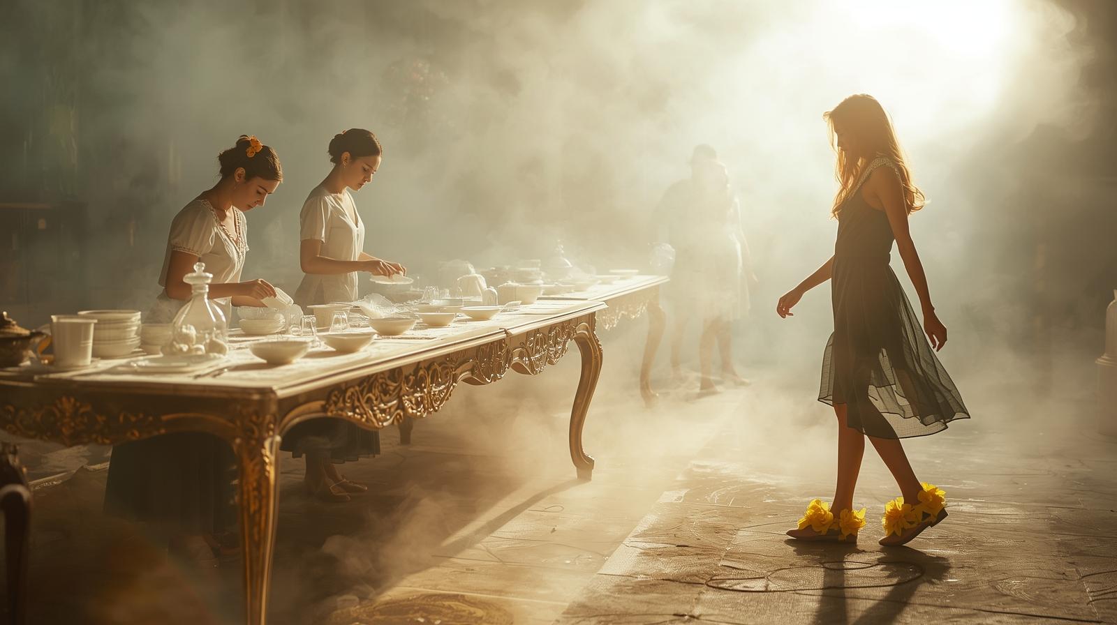 Apoi, într-o noapte, femeia a avut un vis. Un vis lung, dens, static și totuși viu. Erau toate trei – ea, nașa și verișoara – toate mai tinere, ca în vremurile dinaintea demolărilor. Se aflau afară, în întunericul blând al unei seri, la o masă lungă unde nașa și verișoara pregăteau dulciuri. Femeia trecea pe lângă ele, încălțată cu niște pantofi mari, mai mari decât piciorul ei, plini cu flori. Parcă galbene. Vedea doar piciorul drept, ca într-o fotografie ciudată. Nașa i-a întins o bucată de ciocolată neagră, umplută cu cremă albă în interior. S-a mirat – în viață nu primise niciodată ceva de la ea. Dar, acum, era în vis. Visul are propria lui logică, un amestec de adevăr și simbol.
